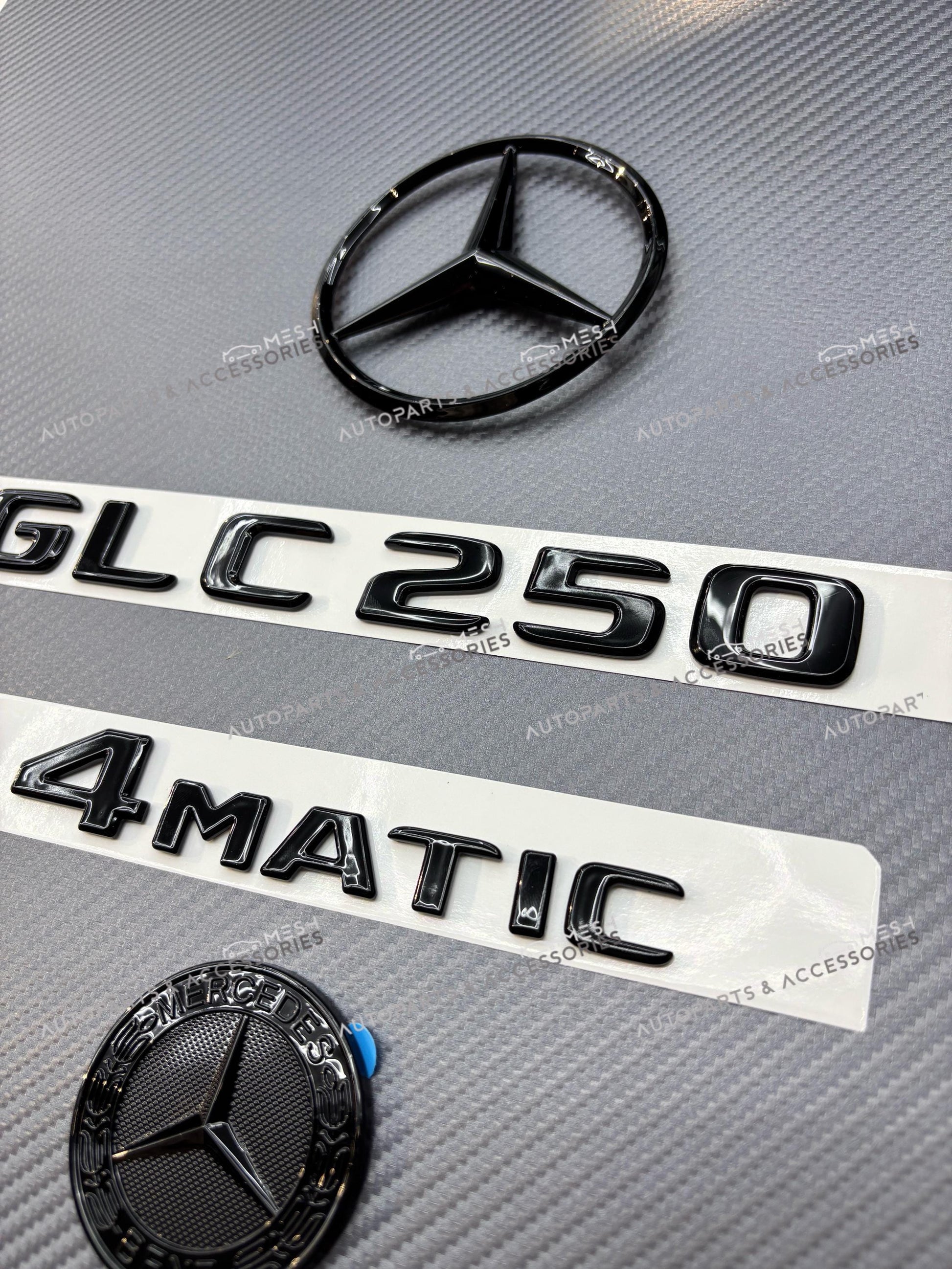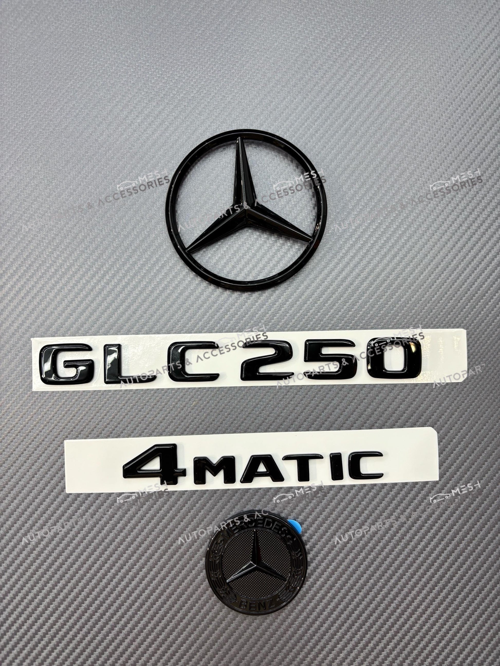 The set includes the front hood star emblem, rear trunk “GLC250” and “4MATIC” badges, and the AMG logo, giving your SUV a unified high-performance look.